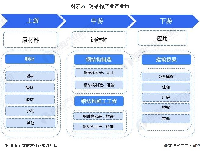 钢结构产业链包括上游钢材生产和制造、中游钢结构制造与施工工程以及下游应用。上游钢材包括板材、卷材、型材、钢带等;中游包括钢结构制造和钢结构施工工程;下游应用包括公告建筑、住宅、厂房、桥梁等。上游钢材产品价格波动直接影响钢结构行业的采购成本;下游行业对钢结构行业的发展具有较大的牵引和驱动作用,它们的需求变化直接决定了行业未来的发展状况。