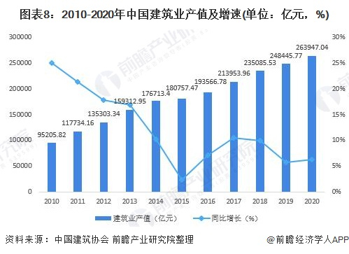 近年来,随着我国建筑业企业生产和经营规模的不断扩大,建筑业总产值持续增长,2010-2020年,中国建筑业总产值由9.52万亿元增长至26.39万亿元。2020年,中国建筑业产值达到263947.04亿元,比2019年增长6.24%。