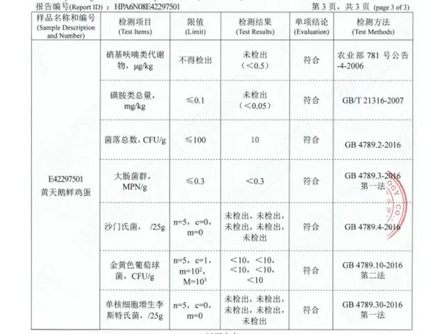 经相关检测机构检测,他家可生食鸡蛋的菌落总数、大肠菌群、沙门氏菌、金黄色葡萄球菌、单核细胞增生李斯特氏菌等多项检测,均符合国家食品标准。