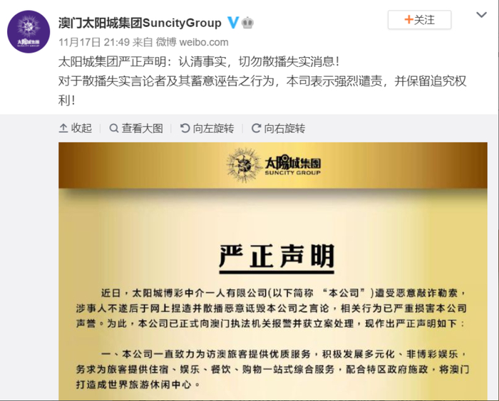 红星资本局注意到,就在周焯华被批捕前10天,11月17日,太阳城集团有限公司通过官方微博发布过一则声明,称太阳城博彩中介一人有限公司遭受恶意敲诈,涉事人敲诈未遂后于网上散布谣言诋毁公司,公司已报警并获立案处理。