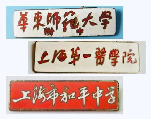 进入高中后,不少学生也开始关注校徽的样式,宽一点样式的是交通大学、同济大学的校徽,长一点样式的是上海第一医学院、华东师范大学的校徽。当然,校徽的形状,除了最常见的长条形,还有椭圆形,圆形,盾形......在长宁区,见得最多的则是华师大、华东政法、华东纺织工学院(东华大学前身)等学校的校徽。听说,这些校徽多由“红军一枝笔”的书法家,上海市华东局的老首长舒同题的字。至今,我的哥哥姐姐还留有华东化工学院、上海第一医学院、上海师院的校徽。这些老校徽易引发怀旧情思,更是值得珍藏的岁月记忆。