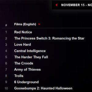 如今在官方榜单上,可以清晰地看到网飞头部节目的动态变化。11月21日,网飞前十榜单迎来了上线后的第一次更新,英语电影的第一名仍旧是《红色通缉令》,周累计观看时长从1.48亿小时降到1.29亿小时,非英语国家电影第一名从上周的意大利电影《谁杀了雅拉》(1795万小时),变为巴西的《低头遇见爱》(963万小时),电视剧榜单第一也发生变化,其中非英语电视剧榜单中,《鱿鱼游戏》已经从上周榜首(4279万小时)降至第三名(3041万小时),但在榜时间已达10周。