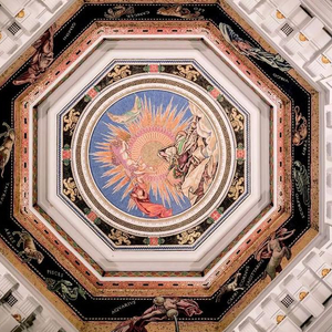 新古典主义风格顶棚(天花)的中央部分也是石膏玫瑰圆形大浮雕,其他部位使用树叶、垂花、花环、阳光四射这些新古典主义图样的石膏装饰。顶棚(天花)通常呈现强烈的色彩,凸出的石膏线条采用白色油漆或描金贴金处理。