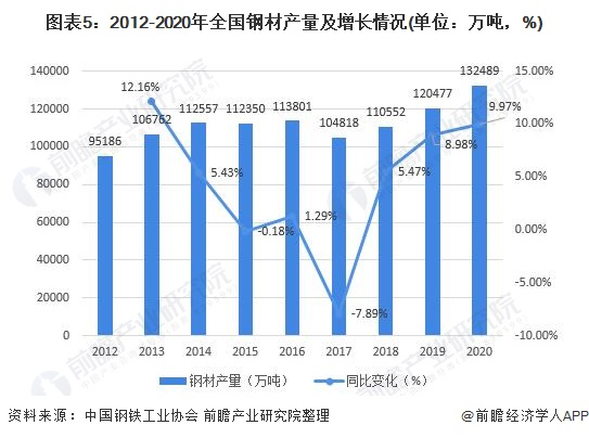 首先,从核心原材料钢铁的供应来看,2012-2016年我国钢材产量逐年提高,但增长速度却越来越小。2017年,钢材总产量为104818.3万吨,虽然同比下降了7.89%,但自2017年起,我国钢材产量又开启了逐年上涨的趋势,2019年,我国钢材产量为120477.42万吨,同比增长8.98%。2020年,我国钢材产量为13.25亿吨,较上年同期同比增加10%。