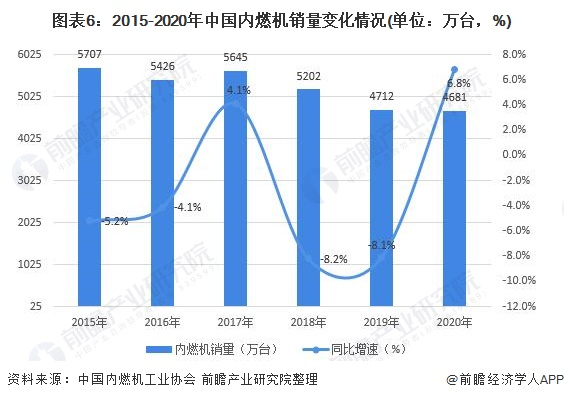 其次,在内燃机方面,我国是内燃机大国,内燃机保有量超过5亿台。据统计,2015-2020年中国内燃机销量波动变化,2020年全年销量为4681万台,同比增长6.8%。
