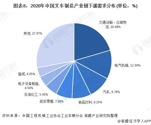 从中国工业车辆分会统计情况来看,我国叉车使用主要在物流业和工业制造中。从细分行业来看,在交通运输和仓储物流的需求规模最大,占比约为20.48%;其次是在电气机械和汽车行业的使用需求,占比分别为12.39%和9.79%。