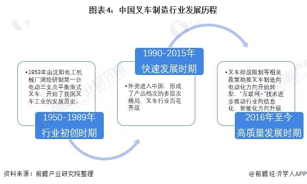 我国叉车工业的发展起步较晚。1953年由沈阳电工机械厂测绘研制第一台电动三支点平衡重式叉车和1958年由五一机械厂(现大连叉车有限公司前身)测绘研制第一台5吨内燃叉车起,开始了我国叉车工业的发展历史。从20世纪70年代后期到80年代中期,全行业先后组织了两次联合设计,奠定了叉车行业的基础;20世纪90年代开始,一些骨干企业在消化吸收引进技术的基础上积极对产品进行更新和系列化,同时外资叉车企业纷纷进入中国,形成了产品档次的多层次格局,使叉车行业百花齐放;2016年以来,在政策和技术的双轮驱动下,国内叉车制造行业向电动化、信息化方向转型升级。