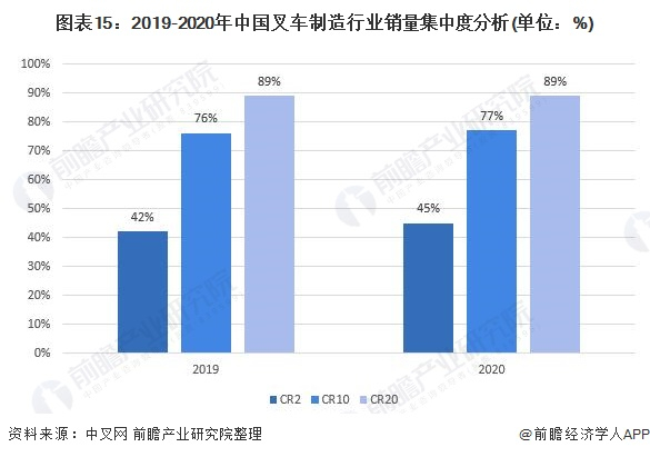 从我国叉车制造行业的销量集中度情况来看,行业的集中度较高。根据中叉网统计,2020年我国前2名企业销量约占全国总销售量的45%以上、前10名约占全国总销售量的77%以上、前20名约占全国总销售量的89%以上,集中度较2019年略有上升,并且主要是前二企业的销量占比增加。
