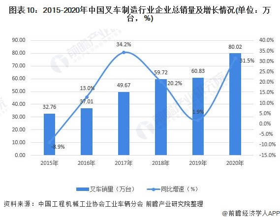在需求方面,2015-2020年,中国叉车行业企业市场销量整体保持增长态势。2020年受益于国内新冠疫情得到迅速控制,国内制造业、物流业的快速恢复,叉车市场需求快速增长,2020年中国叉车制造行业企业销售量80.02万台,同比增长31.5%,突破80万台大关。