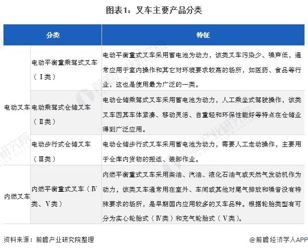 叉车是指对成件托盘货物进行装卸、堆垛和短距离运输作业的各种轮式搬运车辆。按照常见的动力源划分,叉车可分为内燃叉车、电动叉车及手动叉车。按照世界工业车辆统计协会分类,可分为Ⅰ类电动平衡重乘驾式叉车、Ⅱ类电动乘驾式仓储叉车、Ⅲ类电动步行式仓储叉车、Ⅳ类内燃平衡重式叉车(实心轮胎)、Ⅴ类内燃平衡重式叉车(充气轮胎)。其中,第Ⅰ类至Ⅲ类属于电动叉车,第Ⅳ类和第Ⅴ类叉车属于内燃叉车。