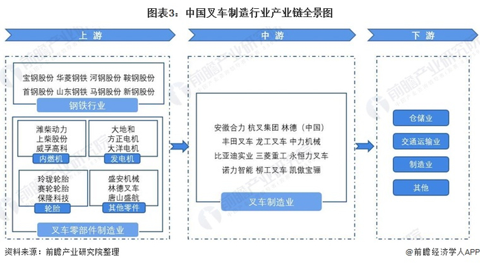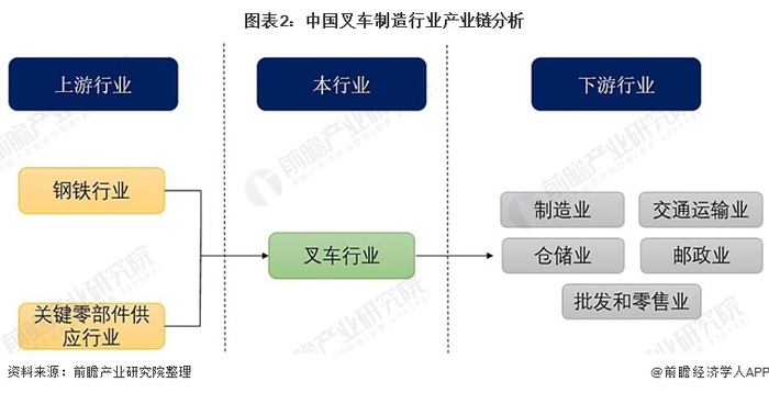 叉车行业的上游主要为钢铁行业和发动机、蓄电池、电机、电控、液压元器件、变速箱、驱动桥等关键零部件供应行业,叉车行业的下游行业分布广泛,主要有制造业、交通运输业、仓储业、邮政业、批发和零售业等多种行业。