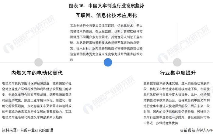 我国叉车制造行业的发展趋势主要表现为三个方面:电动叉车替代内燃叉车趋势、信息化技术应用趋势和行业竞争集中度提升趋势。
