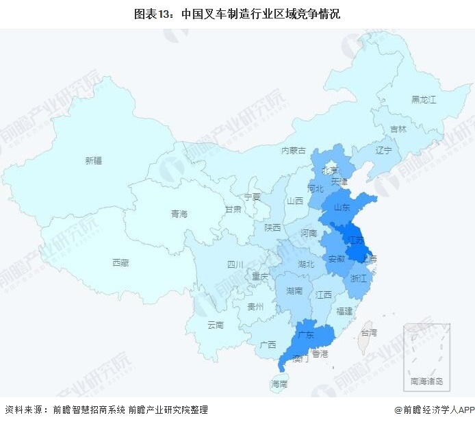 根据前瞻智慧招商系统,我国叉车制造行业企业主要分布在华东和华南的经济发达地区,其中叉车制造产业企业数量分布最多的是江苏省,其次是广东、山东、浙江、安徽、河北等省份。