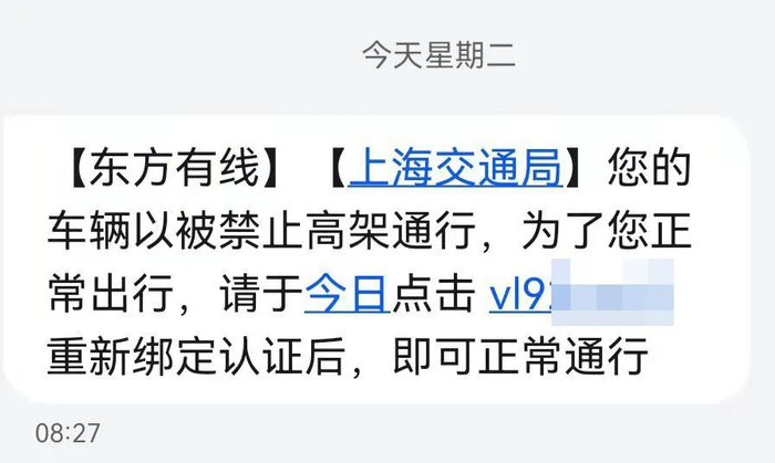 近日,市民刘某收到一条短信,“【东方有线】【上海交通局】您的车辆已被禁止高架通行,为了您正常出行,请于今日点击 vl**.cn/y 重新绑定认证后,即可正常通行”。