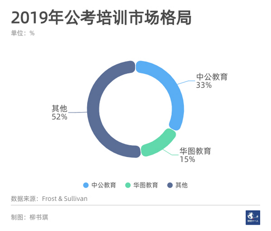 在职业教育领域,公考培训是集中程度最高的赛道。据第三方咨询机构Frost&Sullivan统计,2019年公务员考试培训行业中公教育、华图教育市占率分别为33%和15%,二者合计占比近一半。因此,业内有人将中公教育与华图教育并称为“公考双雄”。