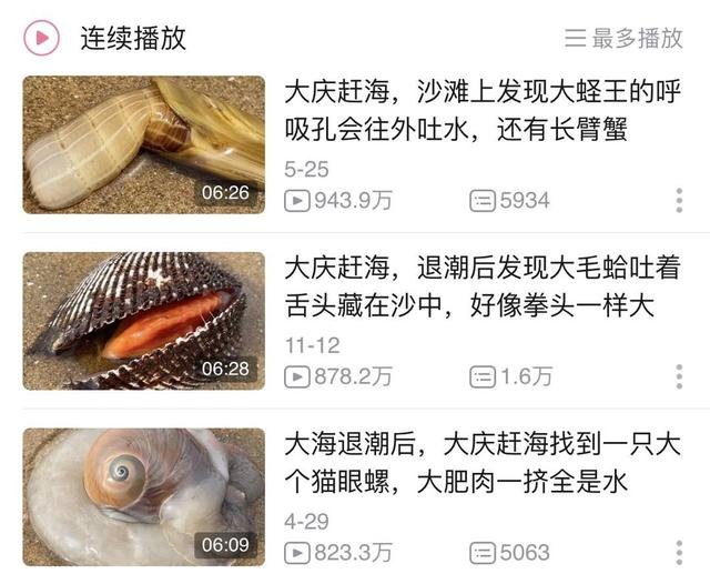 而对于从小就生活在山东、现在正在北京求学的小吴来说,看赶海的视频更像是一种互联网时代寄托乡愁的方式。“在家的时候没太迷恋大庆的视频,回到学校,想念沙东,就看大庆。”从小住在海边的她,也有过“赶海”的记忆。“小时候,妈妈的同事会组织大家一起去青岛或者烟台的海滩。记忆里就只找到小螃蟹、寄居蟹,飘在海里的海草和海带那些,石头上会有小的海虹和很小很小的牡蛎。”最为单纯的童年记忆和视频中的内容重合,给离家求学的她带去了心灵的安慰。这是互联网带来的、慰藉思乡情绪的新型方式。