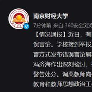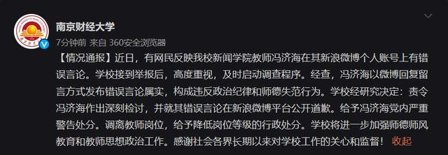 南京财经大学当天早些时候称,近日,有网民反映我校新闻学院教师冯济海在其新浪微博个人账号上有错误言论。学校接到举报后,高度重视,及时启动调查程序。学校对任何师德失范问题将依法依纪依规,严肃进行责任追究,并给予相应的党纪和行政处分。