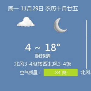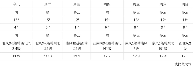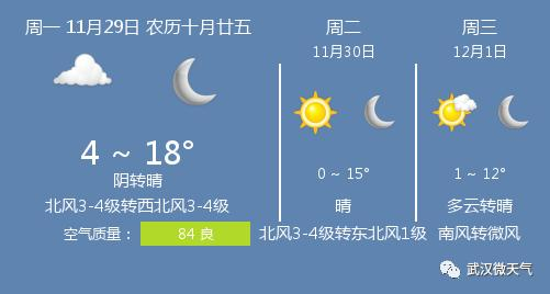 早上好,今天是11月29日,星期一,农历十月廿五。武汉天气:阴转晴,温度 4 ~ 18℃,北风3-4级转西北风3-4级,日出时间 07:01,日落时间 17:22,降雨量 0.0mm,湿度 57%RH。实时:晴,气温 7℃,北风0级,湿度 98%RH,气压 1021Pa,紫外线强度 1级,能见度 2209米。