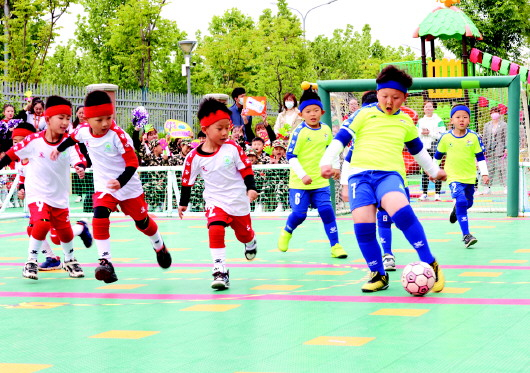活泼好动是幼儿的天性,如何用游戏的方式打开孩子健康成长的“开关”?经过反复探讨,总园长韩德华与集团体育教研部的教师们找到了一个路径:幼儿足球。2021年4月份,集团举行的“绿茵飞扬·足够精彩”幼儿足球嘉年华活动广受好评。各园积极开展幼儿园足球特色活动的探索和实践,其中,机关幼儿园荣获“全国足球特色幼儿园”,华山第三幼儿园荣获“全国足球特色幼儿园示范园”称号,为济南学前教育提供了幼儿体质提升的优质样本。
