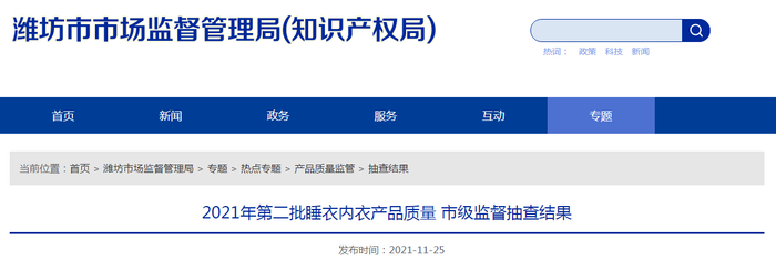 原标题:山东省潍坊市市场监管局公布2021年第二批睡衣内衣产品质量市级监督抽查结果