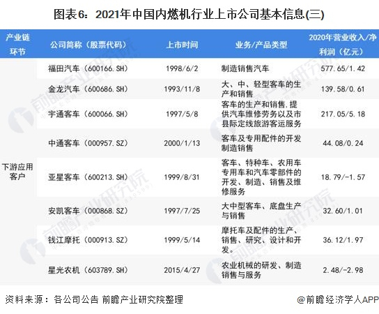 下游应用市场上市企业有:福田汽车(600166.SH)、金龙汽车(600686.SH)、宇通客车(600066.SH)、中通客车(000957.SZ)、亚星客车(600213.SH)、安凯客车(000868.SZ)、钱江摩托(000913.SZ)、星光农机(603789.SH)等。