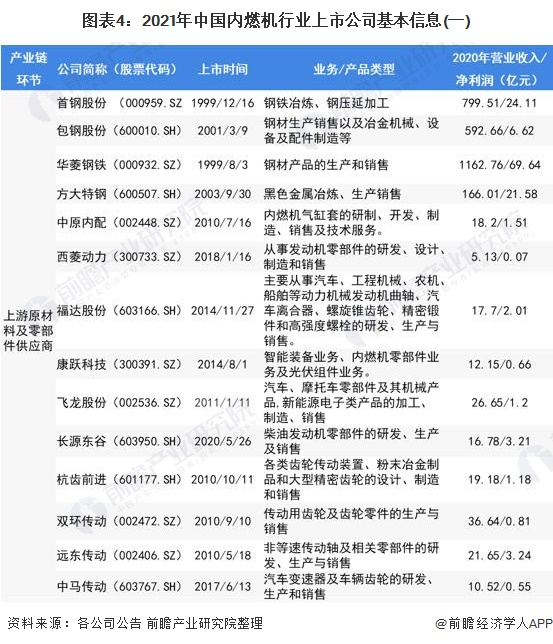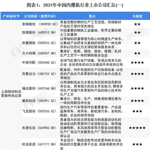内燃机产业链各环节上市公司:目前国内内燃机产业链上游的上市企业主要有:首钢般份(000959.SZ)、包钢股份(600010.SH)、华菱钢铁(000932.SZ)、方大特钢(600507.SH)、中原内配(002448.SZ)、西菱动力(300733.SZ)、福达股份(603166.SH)、康跃科技(300391.SZ)、飞龙股份(002536.SZ)、长源东谷(603950.SH)、杭齿前进(601177.SH)、双环传动(002472.SZ)、远东传动(002406.SZ)、中马传动(603767.SH)、广汽集团(601238.SH)、东风汽车(600006.SH);