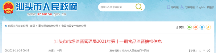 中国质量新闻网讯 近日,广东省汕头市市场监督管理局发布2021年第十一期食品监督抽检信息。