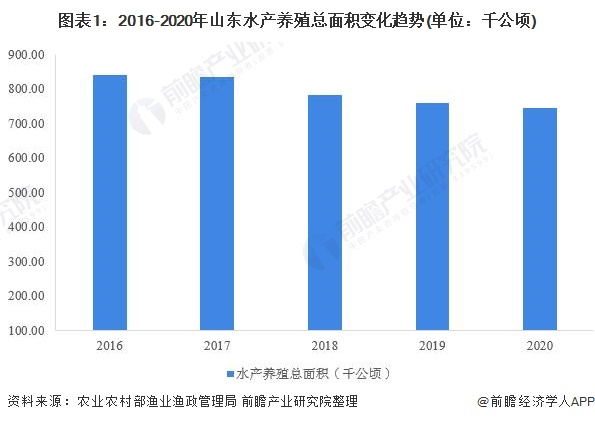 山东是渔业大省,水域滩涂广阔、渔业资源丰富、开发潜力巨大,水产品总产量、渔业经济总产值位居全国前列。2016年以来,随着山东省科学规划布局养殖生产,规范养殖秩序,设定发展底线,保障渔民合法权益,保护水域滩涂生态环境,促进水产养殖业绿色发展的发展路径的持续推进,山东省水产养殖面积呈现出持续下滑的发展势头,到2020年,全省水产养殖面积增长至744.62千公顷,同比下降1.9%。