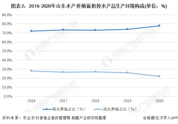 从水产养殖面积构成来看,目前山东海水养殖面积远超淡水养殖面积,2016年以来,山东省海水养殖面积占总面积的比重维持在70%以上,到2020年,全省淡水养殖面积为164.27千公顷,占总面积的22.1%,海水养殖面积为580.35千公顷,占总面积的77.9%。