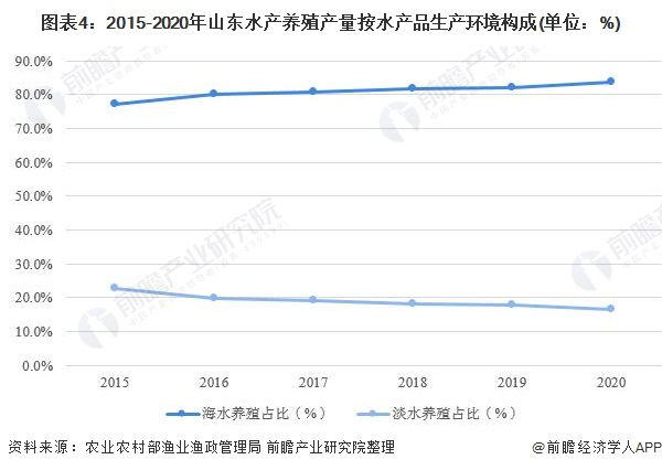总体来看,目前,山东省淡水养殖产量和海水养殖产量有较大差距,2015年以来,山东海水养殖总产量市场份额保持在80%以上。2020年,全省淡水养殖产量为100.95万吨,占总产量的16.4%;海水养殖产量为514.14吨,占总产量的83.6%。