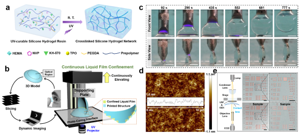 近日,该课题组提出了一种基于数字光处理(DLP)技术的连续液膜限制的3D打印策略,消除了逐层打印过程中出现的台阶效应,实现了高精度3D结构的制备。在连续打印过程中,附着在固化结构外的液膜始终受到固-液界面的限制。该液体树脂-固化结构界面的限制作用增强了未固化的液体树脂吸入并填充于相邻图案层之间的间隙,以消除台阶效应;亦可作为液体刮刀刮除固化结构外包覆的多余树脂,以实现高保真打印。由于粘附的液膜是作为过渡层而不是传统上认为的液体树脂残余物,因而避免了后清洗步骤。研究优化墨水性质和打印参数,可较好地控制3D打印隐形眼镜结构的液膜厚度和表面光滑度。此外,该技术还可以抑制热累积和热扩散,确保连续打印过程的稳定性。基于这一打印策略,科研人员制备出具有极高的光滑度(均方根粗糙度小于1.3 nm)、均匀的机械性能、良好的生物相容性以及高光学质量(透光性和光学分辨率达96%和228.1 lp/mm)的隐形眼镜结构。