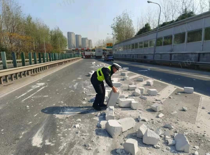 高速公路石块散落阻通行 民警徒手“搬砖”紧急清理车道