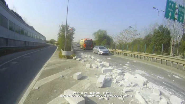 混凝土石块散落了一地,绵延了二三十米,影响了上海方向主线下匝道。沈力迅速和指挥中心取得联系后,为了不影响交通通行,果断处置,立即上前和辅警吴嘉禄一起徒手“搬砖”,将地上的散落物一块块搬开,尽快将一条车道清空,确保了车辆行进路线不受阻。