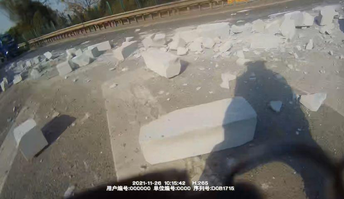 11月26日,在s4高速公路大叶公路匝道附近,一辆拖运混凝土石块的大货车正准备驶出高速,由于车速过快,货物捆扎不牢,致使车上装载的货物被甩出,大量石块散落在s4高速公路上,影响了后续车辆通行。正在对向车道执勤的奉贤交警支队一大队民警沈力发现后,立刻翻越中间隔离带,火速来到现场查看情况。