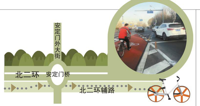 二环路安定门桥、东直门桥、东四十条桥、朝阳门桥都是环岛路段,骑行过环岛,需要遵循相对特殊的骑行规则。以安定门桥为例,从北二环南侧辅路西向东骑行来到安定门环岛,眼前的非机动车道“分叉”变成了两条。右边的非机动车道是右转道,从这条车道可以向南去往安定门内大街;而如果想向东沿着环路继续直行,则要走左边的非机动车道,这条直行非机动车道会从环岛下方穿过。于是问题来了——继续在环路内直行的骑行者在向左侧非机动车道变道的过程中,要斜穿过一条机动车辅路,由此便与直行的机动车有了交集。骑行者无法实时关注后方来车的情况,一旦车流量较大,在短暂的机非混行变道当中,双方都有顾虑。市民反映,二环路慢行系统大大提升了骑行的舒适度,但唯独在这个变道的点位上,不得不“捏闸”。