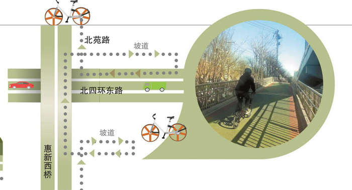 以北四环路惠新西桥为例。干杨树甲16号院位于北四环路北侧,有居民反映,骑车下班回家,想从四环路南面骑到北面不是一件容易的事,惠新西桥明明是座立交桥,却没有给非机动车提供任何的便利,绿色出行太费腿。