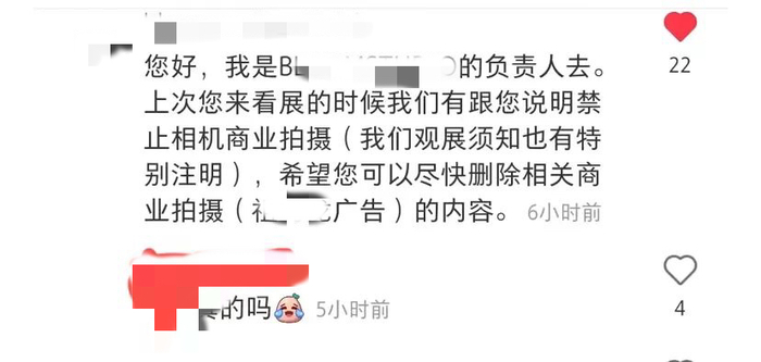 不久之前,一名网红以独特视角下的外滩和陆家嘴为背景拍摄了一组照片,并在照片上打上了某香水品牌的名字。随后,该网红当天拍摄的展览场所负责人在其照片下留言,希望其删除照片,因为这名网红是以观展之名进入展览场所,而观展须知里明确不能进行商业拍摄,现场工作人员还曾数次提醒。最后,该网红删除照片并表示道歉和赔偿。