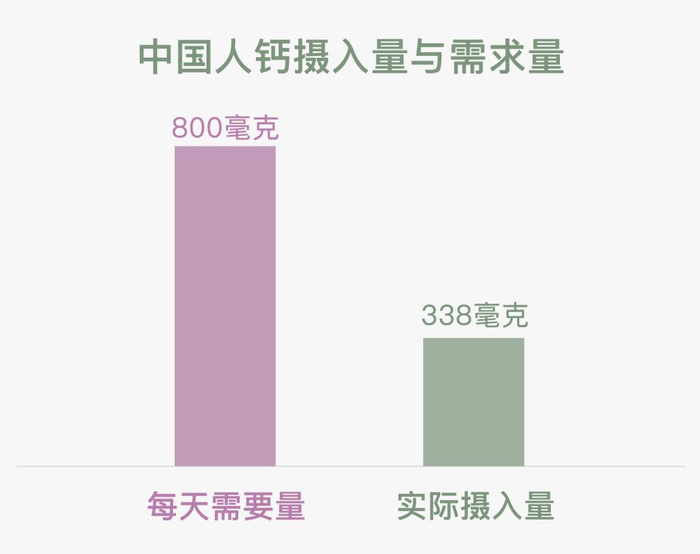 根据国际骨质疏松基金会的数据:中国人每天平均摄入钙 338毫克 。而《中国居民膳食指南》的推荐:成年人每天需要摄入钙 800毫克 。