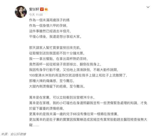 ▲安以轩被咖啡烫伤后发的微博