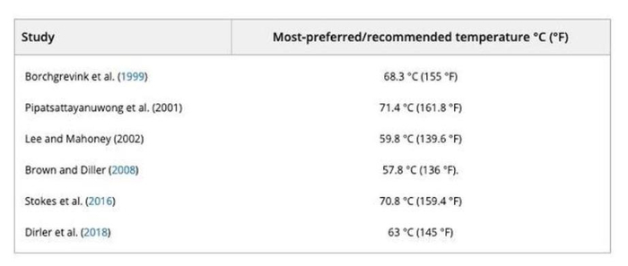 ▲不同研究对消费者咖啡温度喜好范围的调查,右列温度表示,虽然研究不同,但是结论基本上都是咖啡温度在60-70摄氏度口感最好