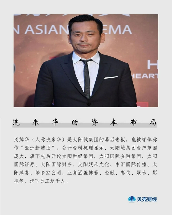 周焯华是太阳城集团的幕后老板,也被媒体称作“亚洲新赌王”。公开资料梳理显示,太阳城集团资产范围庞大,旗下先后开设太阳世纪集团、太阳国际金融集团、太阳国际证券、太阳国际财务、太阳娱乐文化、中汇国际传播、太阳臻荟、等多家公司,业务涵盖博彩、金融、餐饮、娱乐、影视等,旗下员工超千人。