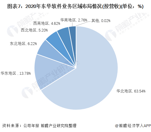 2020年,东华软件营收主要来自华北地区,华北地区营收占比为63.54%;其次为华东和东北地区,营收占比为13.78%和6.22%。
