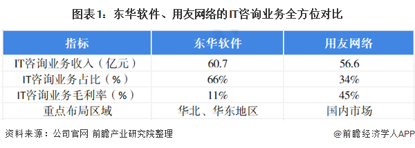 东华软件和用友网络作为我国IT咨询行业的龙头企业,其业务的布局区域和企业经营业务均有所不同。2020年,东华软件IT咨询业务营收为60.7亿元,IT咨询业务占比为66%,主要布局在华北、华东等地;用友网络咨询业务营收为56.6亿元,IT咨询业务占比为34%,其业务在全国范围内布局。