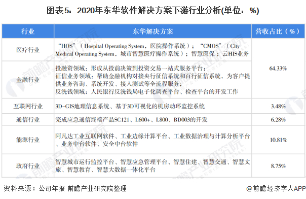 东华软件目前构建了东华医为、健康乐互联网医院、东华博泰、银企汇、华金在线、东华智慧城市等超过二十种的品牌矩阵,并完成医疗、金融、智慧城市、能源、企业服务等多维度多行业的互联网生态平台布局。2020年,公司金融健康行业营收占比最高,占全部营收的64.33%。其次为能源行业,营收占比10.81%。
