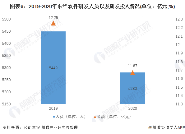 2020年,东华软件研发人员为5280人,研发投入为11.67亿元,研发投入占比为12.73%,研发投入略低于2019年,