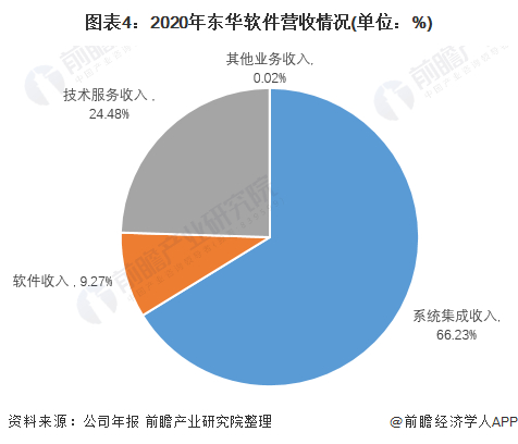 2020年,东华软件系统集成业务营收最高,占比66.23%,其次为技术服务收入,占比为24.48%,软件收入占比9.27%。