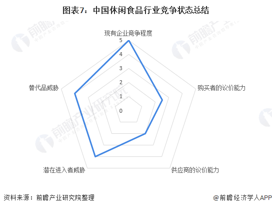 运用波特的“五力”模型,对休闲食品行业各方面的竞争情况进行量化,5代表最大,0代表最小,其竞争情况如下图所示: