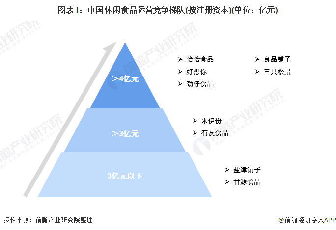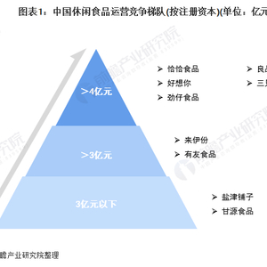 依据企业的注册资本划分,中国休闲食品行业可分为3个竞争梯队。其中,注册资本大于4亿元的企业有洽洽食品、良品铺子、好想你、三只松鼠、劲仔食品;注册资本在3-4亿元之间的企业有:来伊份、有友食品;其余企业的注册资本在3亿元以下。
