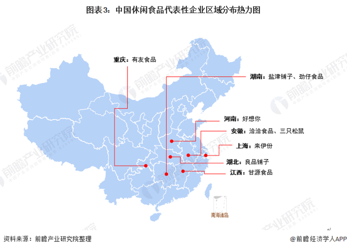 从代表性企业区域分布看,湖南省休闲食品主要代表企业包括盐津铺子食品股份有限公司、劲仔食品集团股份有限公司;安徽省休闲食品主要代表企业包括洽洽食品股份有限公司、三只松鼠股份有限公司;江西省代表企业有甘元食品股份有限公司,上海市代表企业有上海来伊份股份有限公司,河南省代表企业有好想你健康食品股份有限公司等。