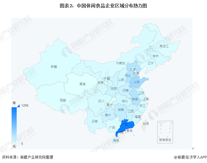 根据前瞻智能招商系统统计,中国休闲食品行业生产企业数量较多,且多为中小规模企业。通过对企业所在地进行汇总可知,相关企业重点集中在广东地区,其次为山东、河北、安徽等地,行业集中程度较高。